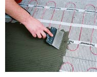 8. Равномерно залить нагревательный мат тонким слоем плиточного клея или иного самовыравнивающегося раствора. Греющий кабель и соединительная муфта должны быть залиты полностью.